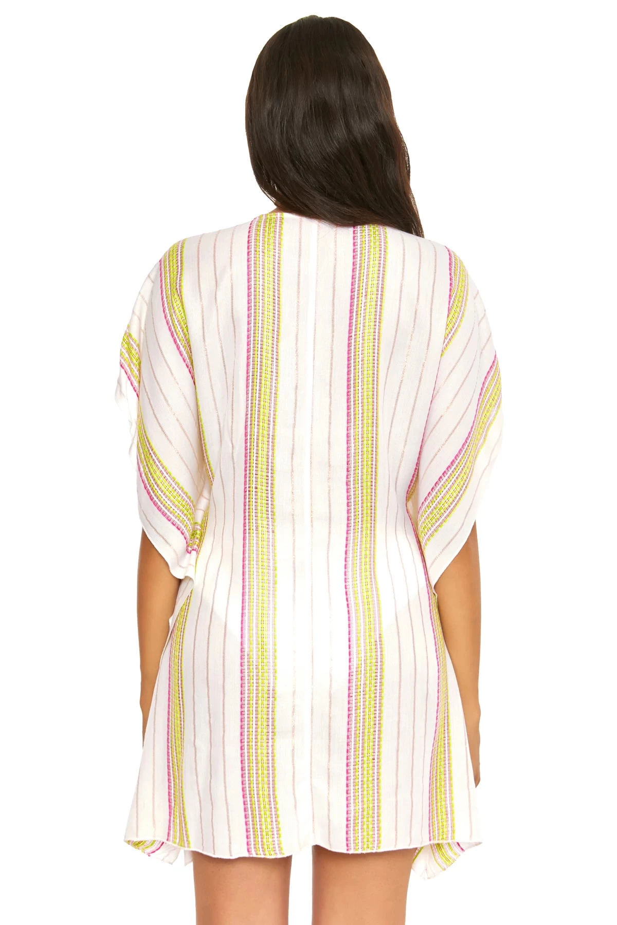 Radiance woven pull over tunic features gold metallic stripes alternating with jacquard striping, a plunging neckline, and wide flutter sleeves with side slit openings. Offers a smocked front waist.