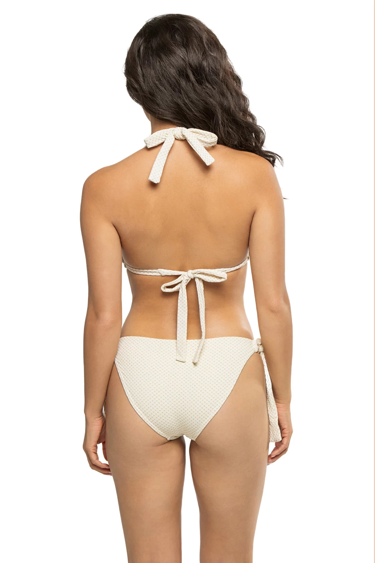 Riley halter bikini top features a recycled pique textured fabrication with sliding knots for personalized coverage and removable cups. Offers a double under bust band and power mesh for additional lift and support. Tailored to fit cup sizes C to F.