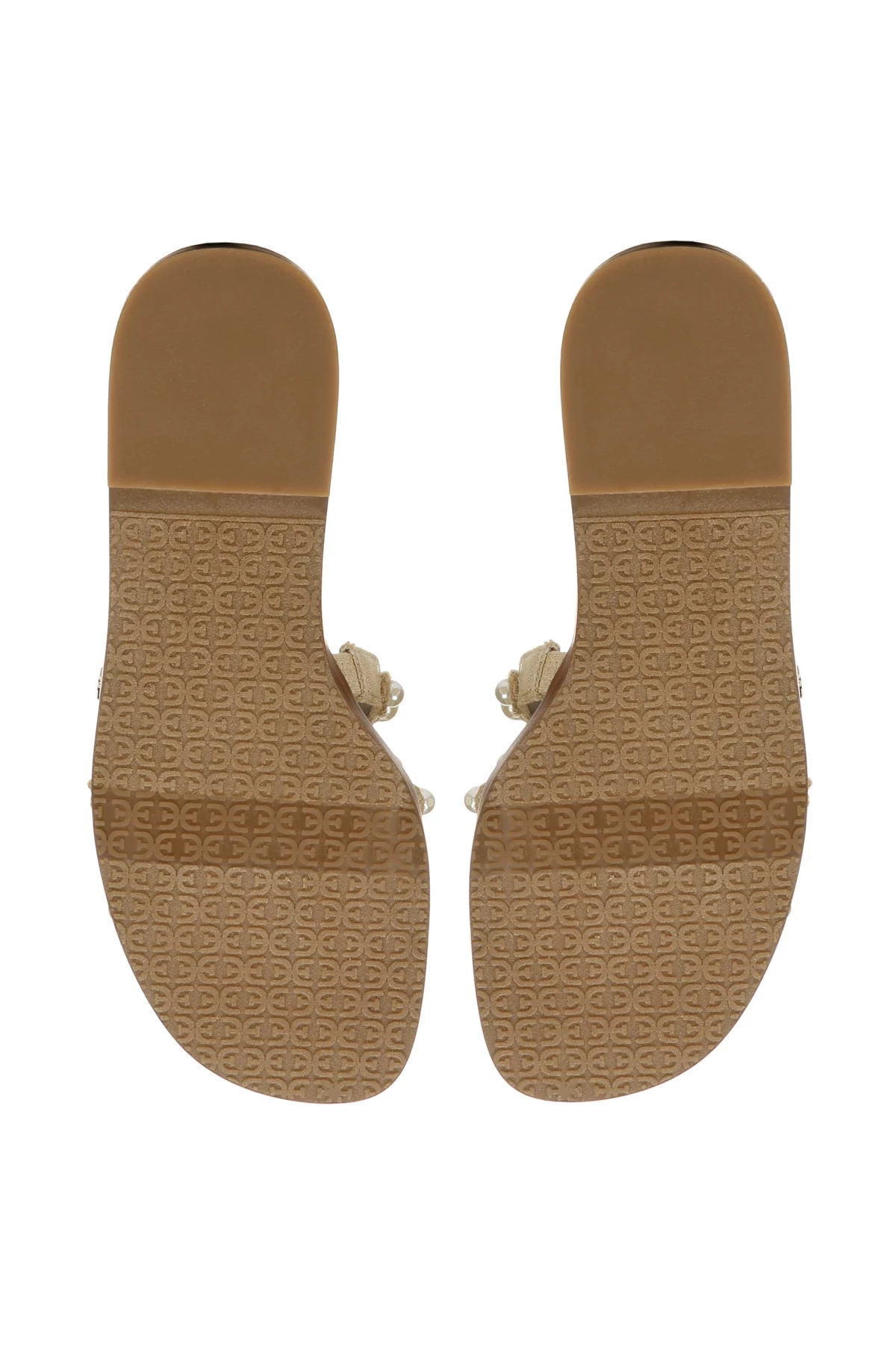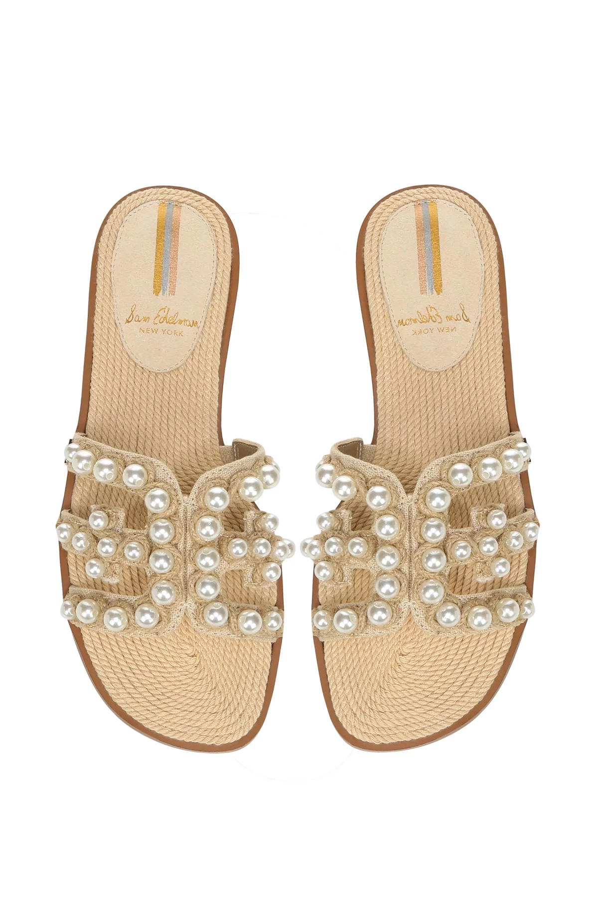 Bay Pearl slides feature a woven raffia sole and pearl embellished straps.