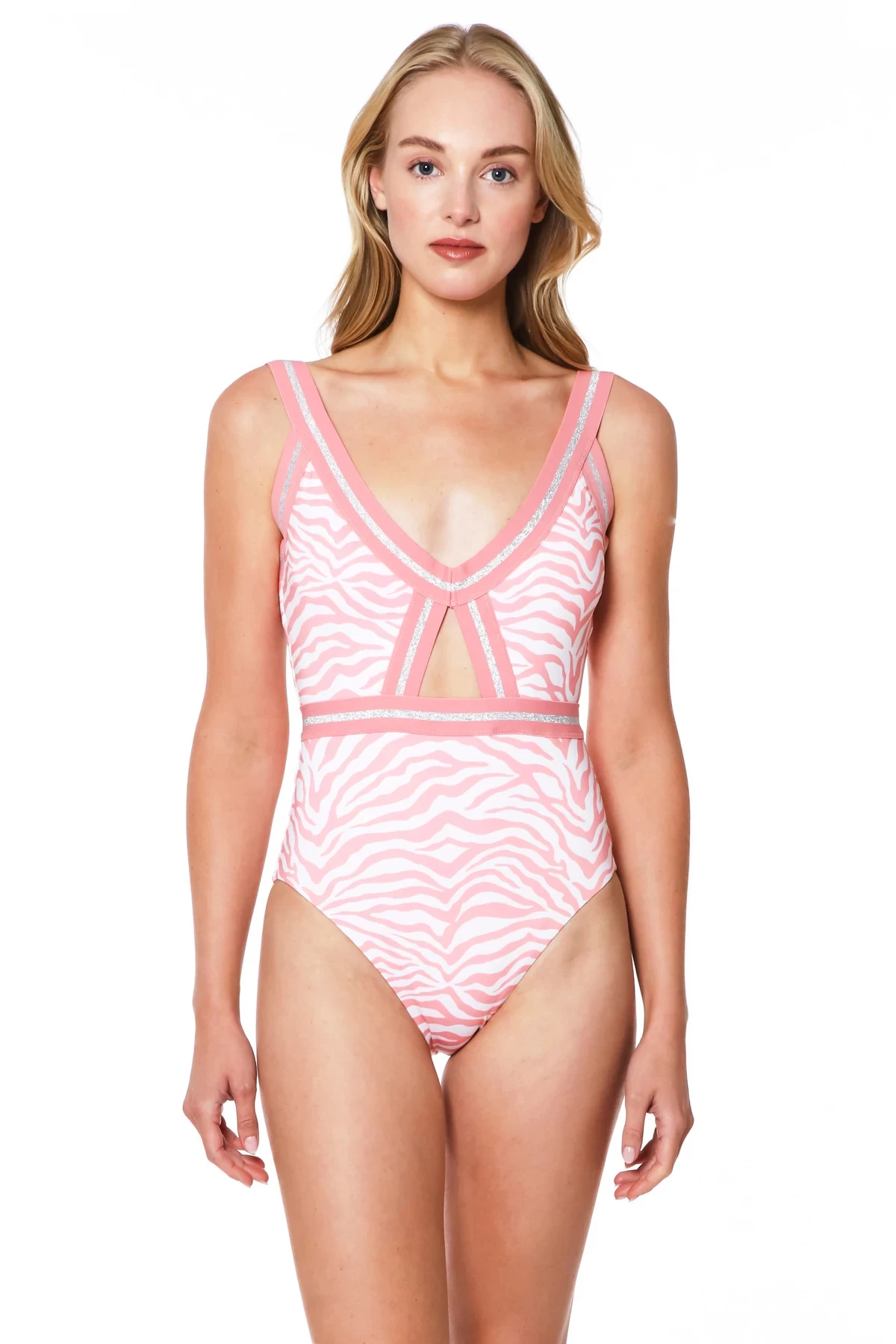Monokini one piece swimsuit features a tiger print, removable cups, and center cutout. Offers adjustable shoulder straps, a hook back closure and moderate bottom coverage.