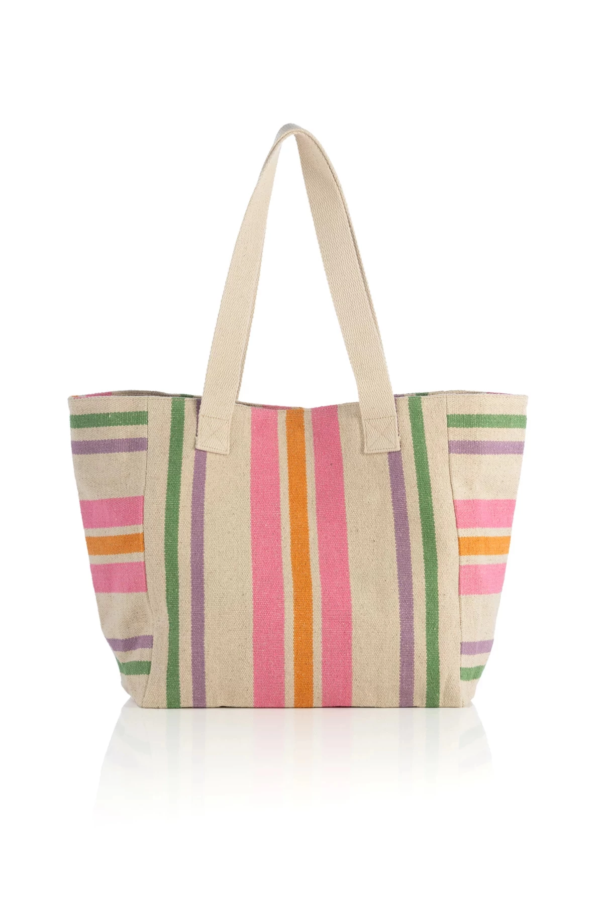 Sandra tote features a colorful stripe pattern and offers an interior zip and slip pocket with double top handles.