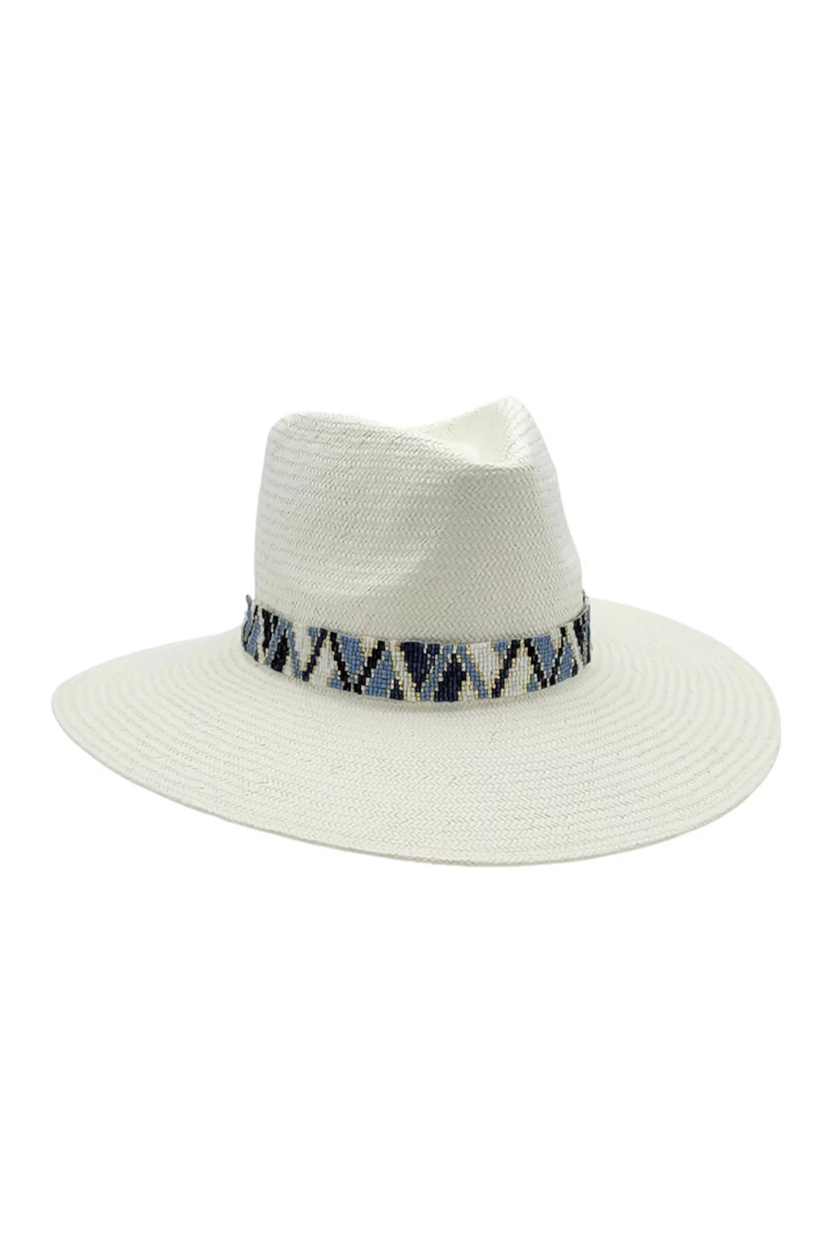 Santorini panama hat features a beaded trim and offers an adjustable head size.