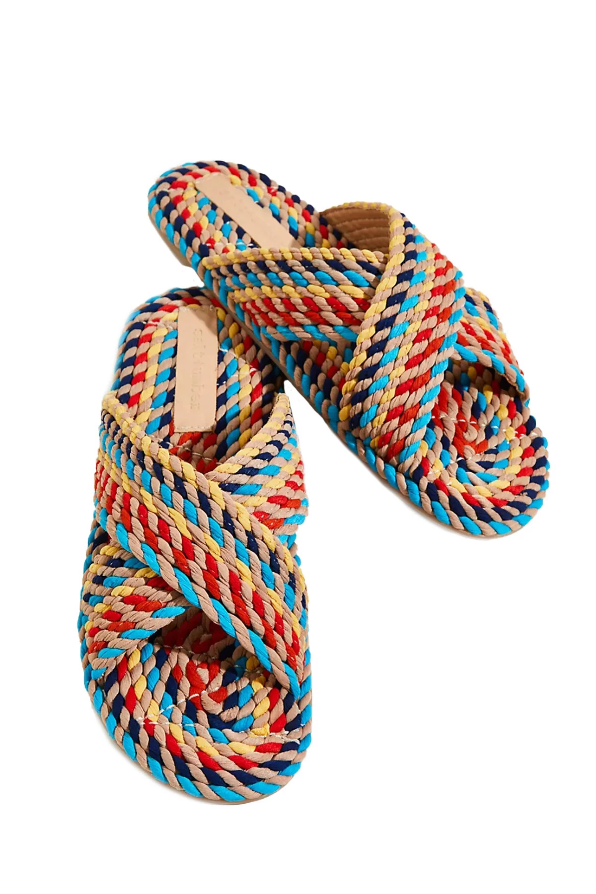 Saraya slides feature a colorful woven rope fabrication with wide crisscross straps.