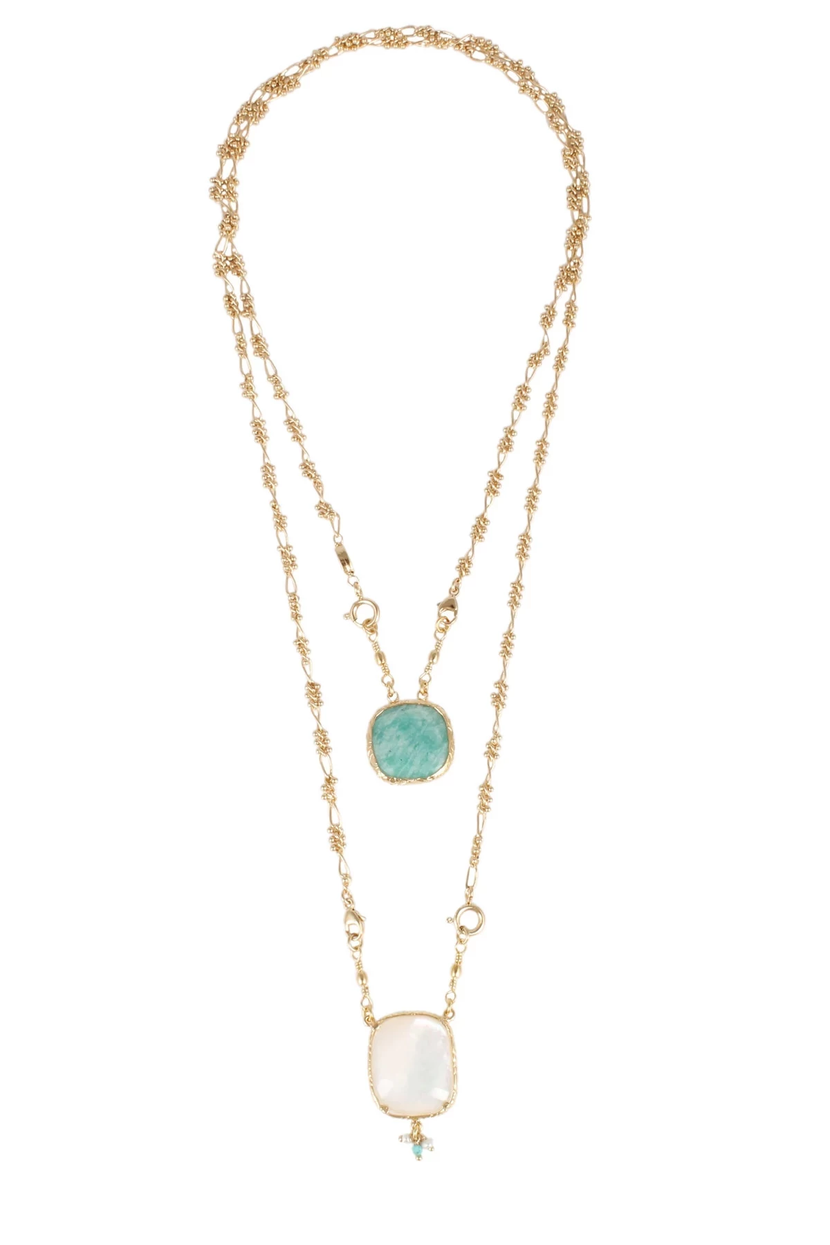 Scapulaire serti necklace features 24k gold-plating adorned with rocaille beads and semiprecious stones. Double clasps make this necklace convertible from a single long necklace, double necklace, or two separate short necklaces.