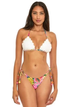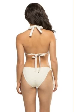 Sea Dive bralette bikini top features a texturized fabric with a drawstring v-front and offers a clip back closure, removable soft cups, and adjustable straps.