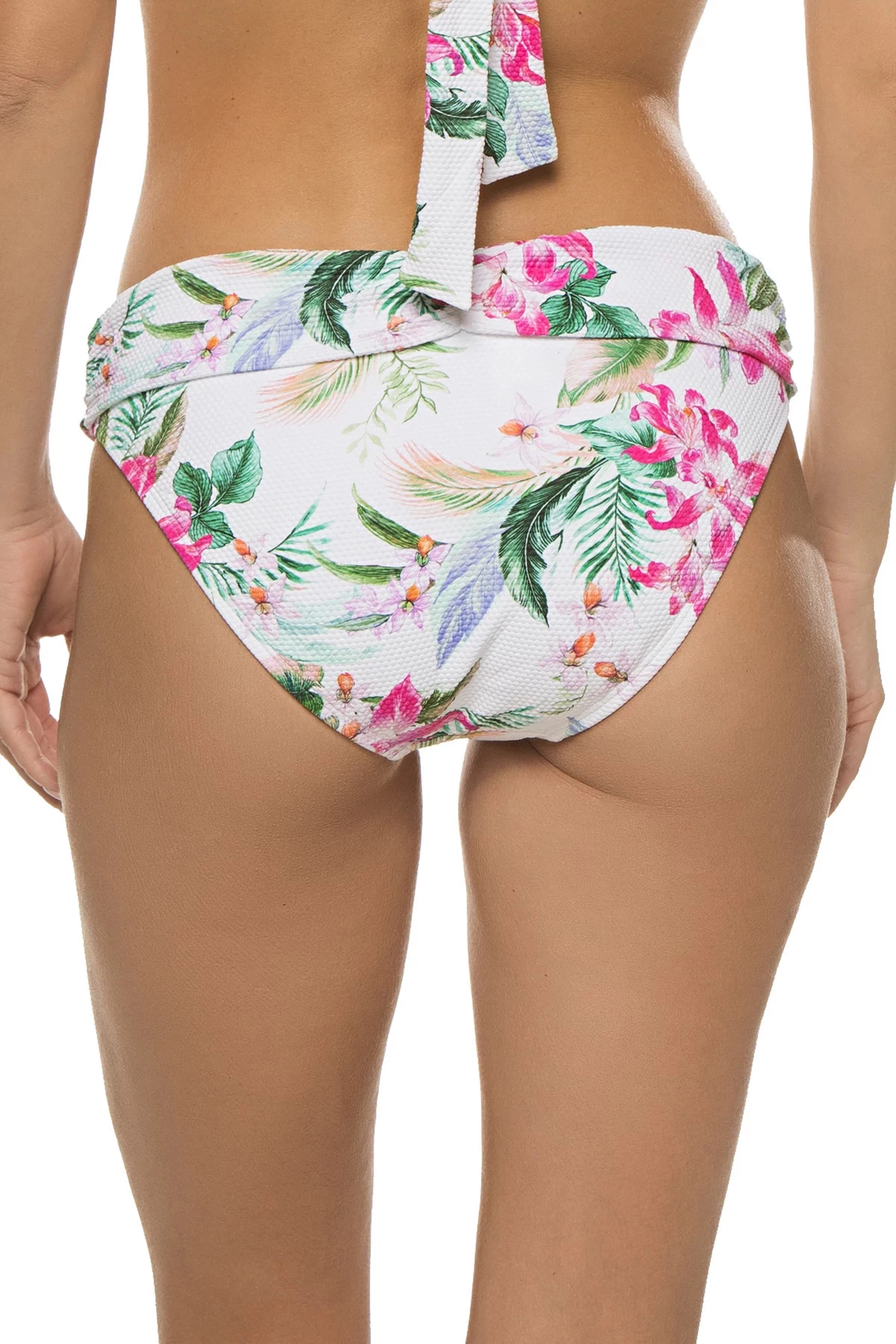 Hipster bikini bottom features an elegant print and offers a shirred waistband with moderate coverage.