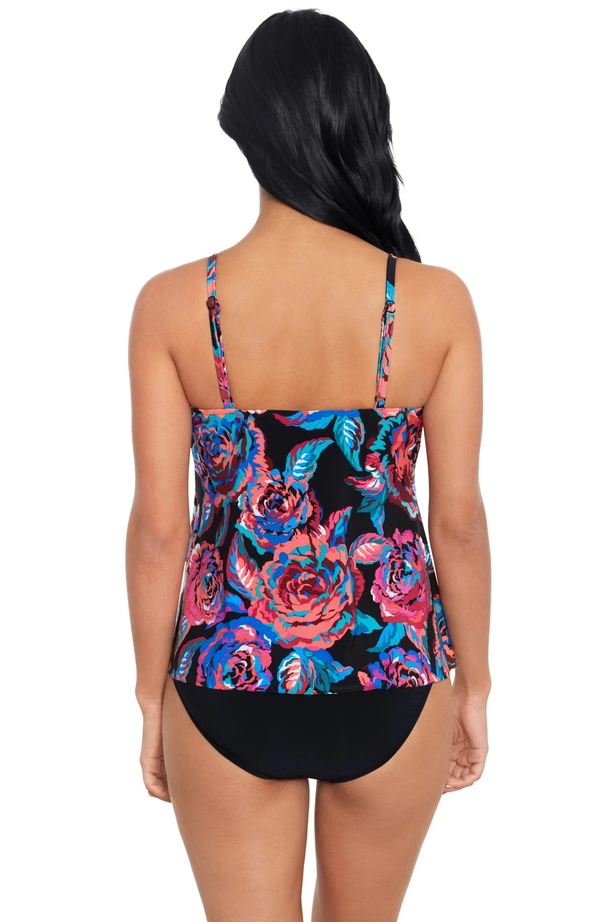 Chloe tankini top features a tasteful floral print with ruffles and offers removable soft cups.