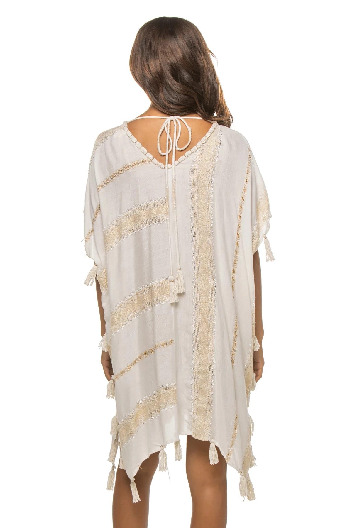 Stripes square tunic features metallic details with decorative tassels and bead detailing along the neckline and center.