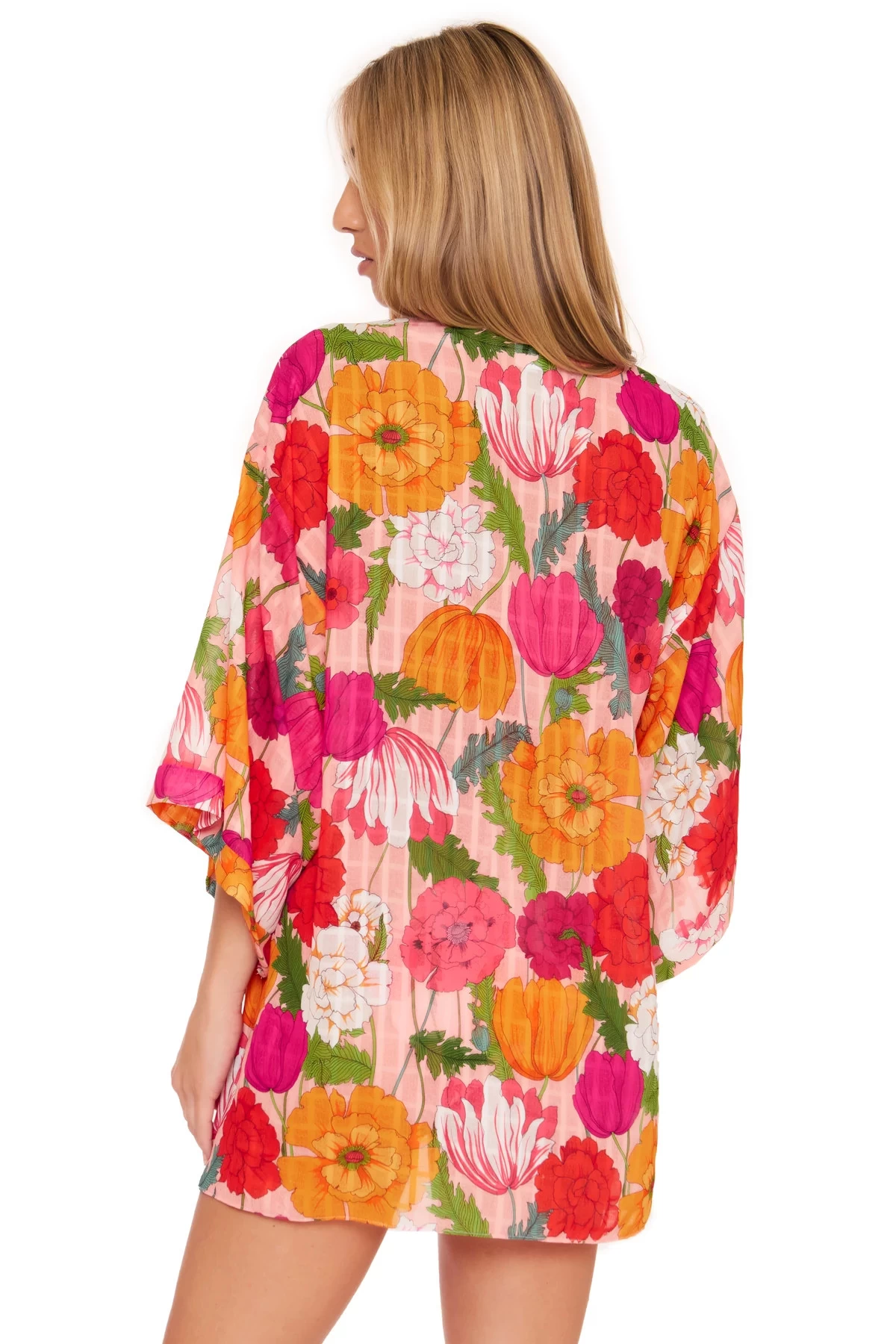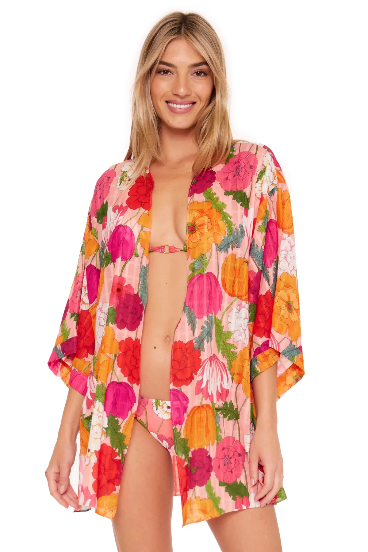 Sunny Bloom kimono features a bold floral print with wide flutter sleeves and offers a multi-wear option as an open front or tied at waist.