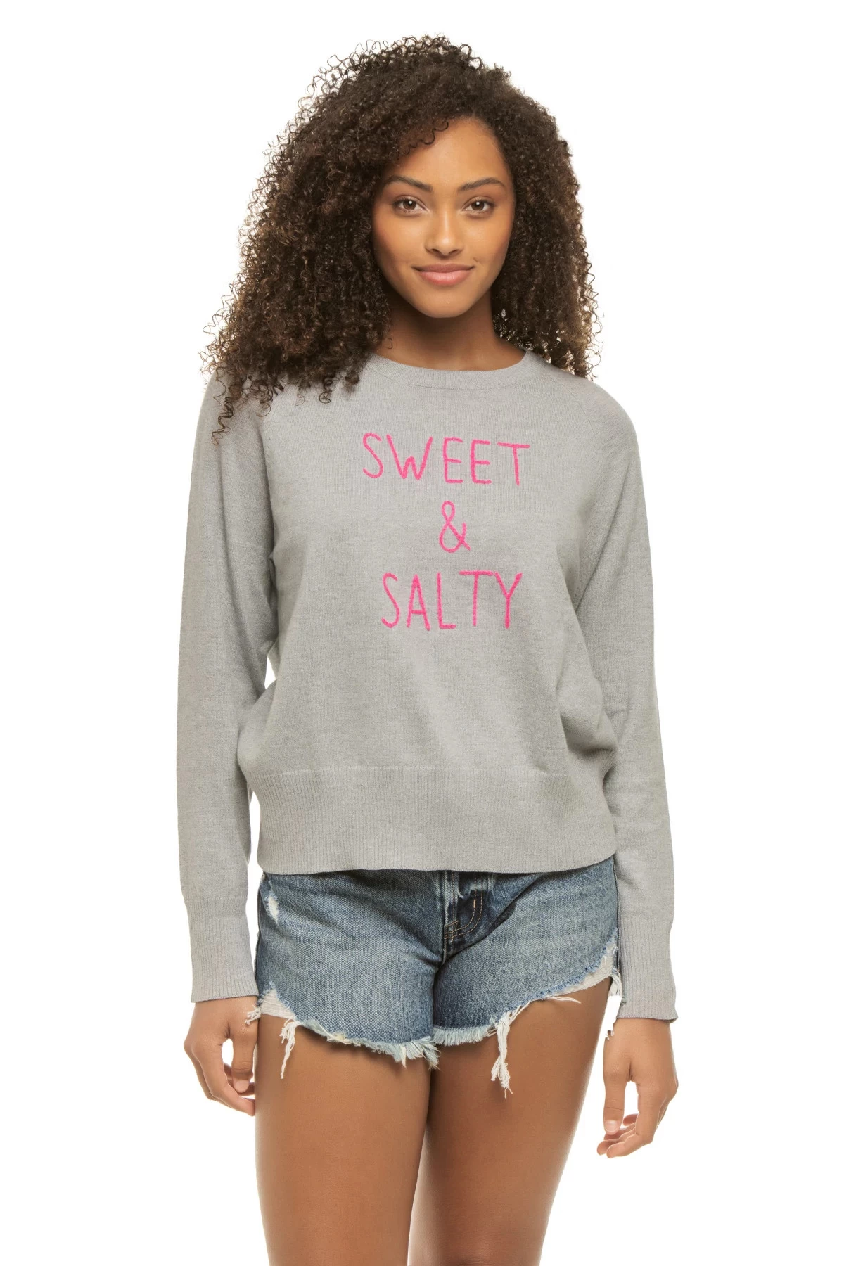 Sweater features a bold “Sweet & Salty” graphic with long sleeves.