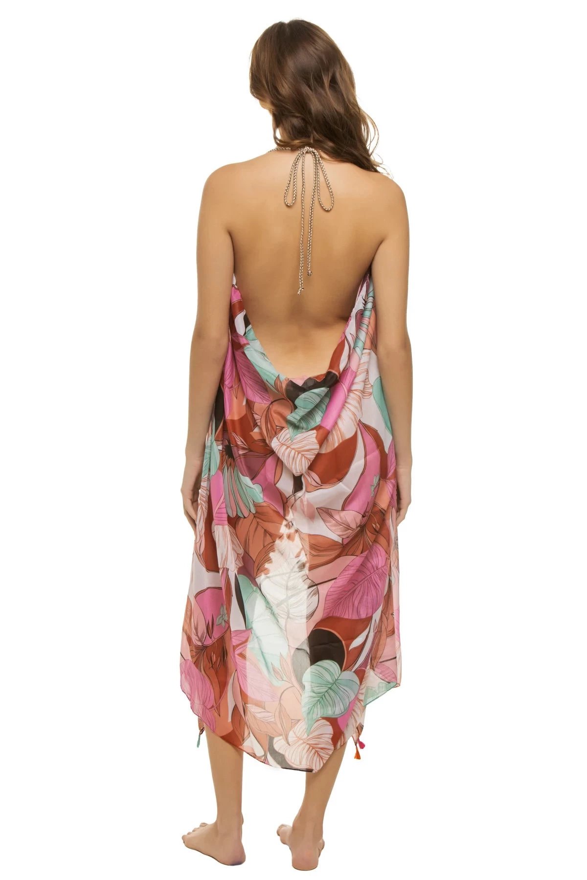 Midi dress features a palm print with decorative tassels and offers adjustable halter ties.