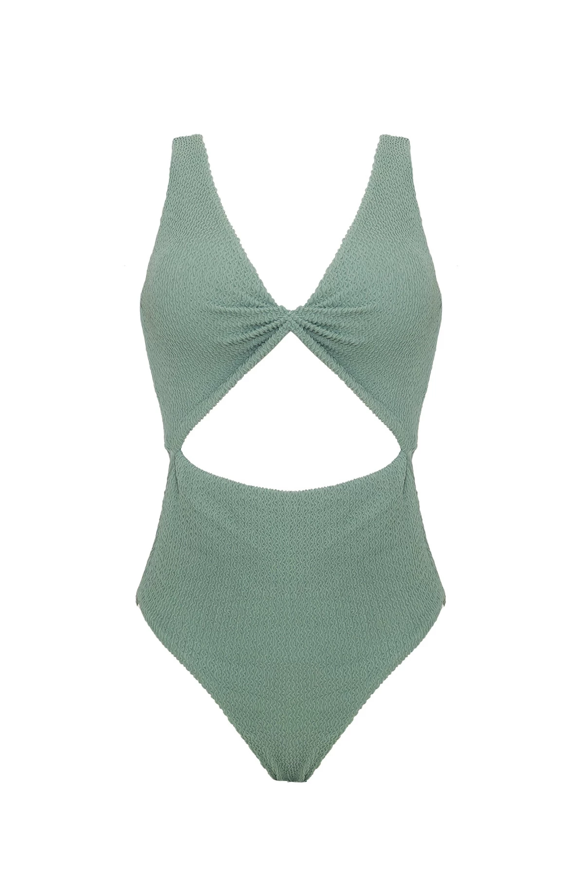 Wave trix one piece features a textured fabric with a front cut out and twist details. Offers a high leg cut, removable soft cups, adjustable tie back, and moderate coverage.