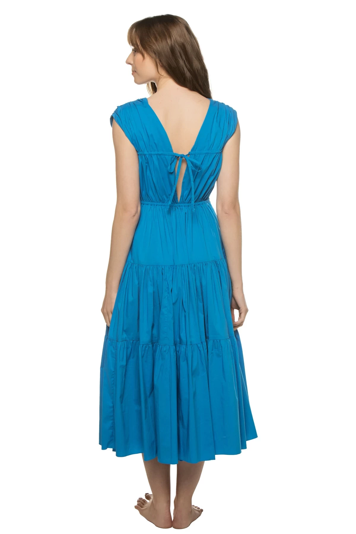 Thylane midi dress features a deep v-neckline and offers short cap sleeves and a tiered flowy skirt.