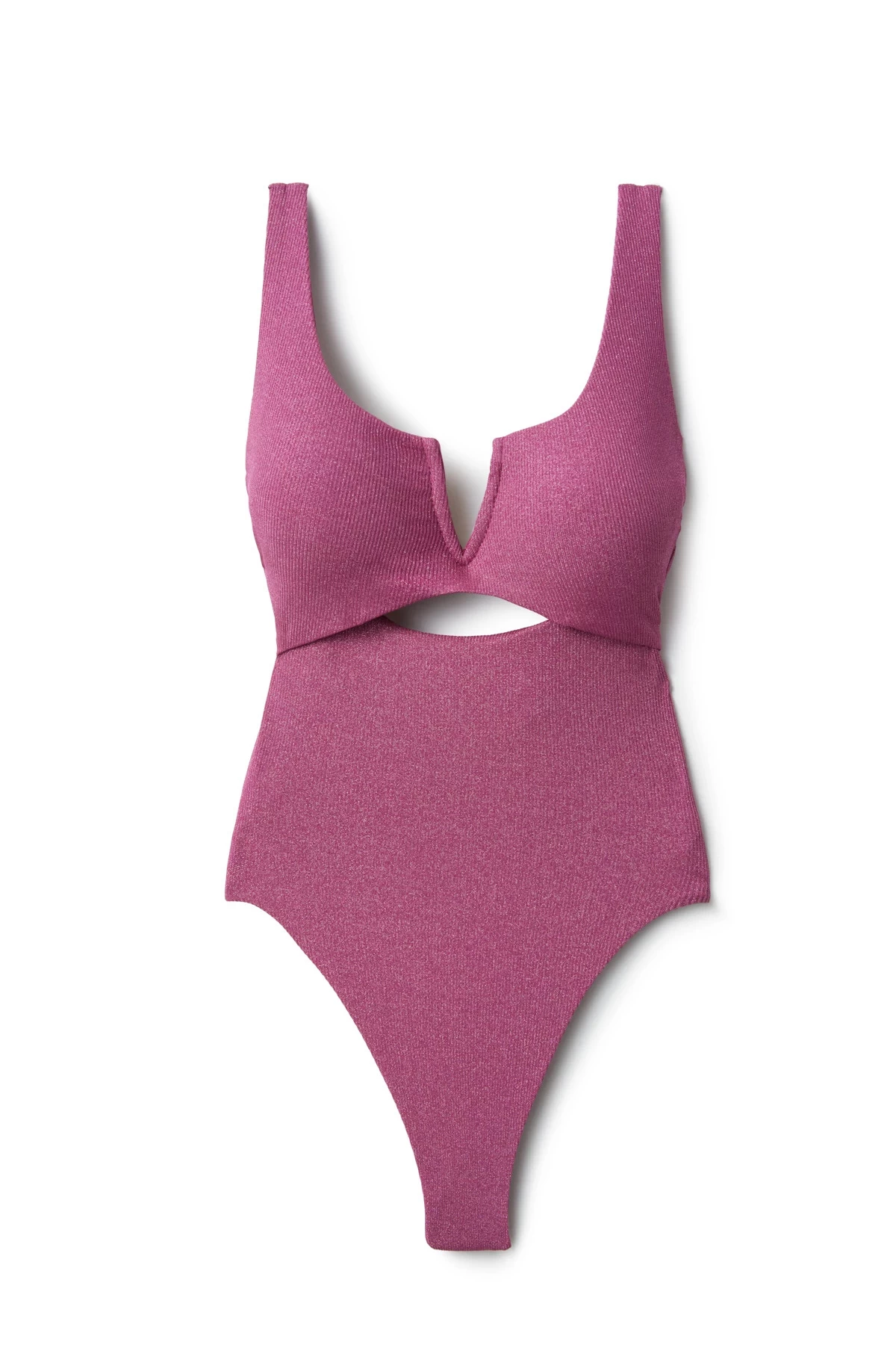 Waikiki one piece swimsuit features a metallic fabric, v-wire scoop neckline, cutout front, scoop back, and high leg cut.